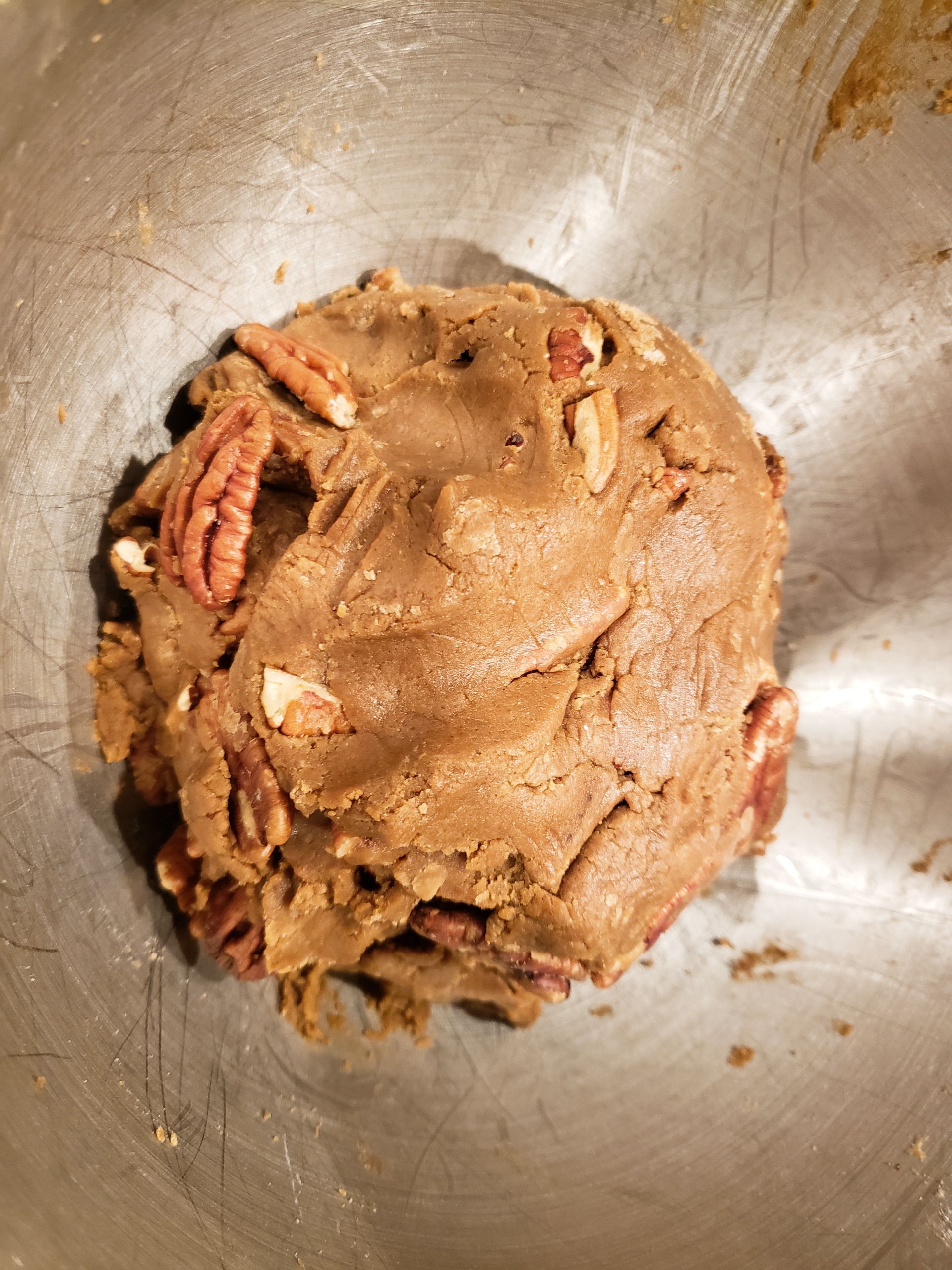 Add pecan or walnuts into the mixture. Carefully blend them and avoid breaking nuts. I use hands since it is easier.