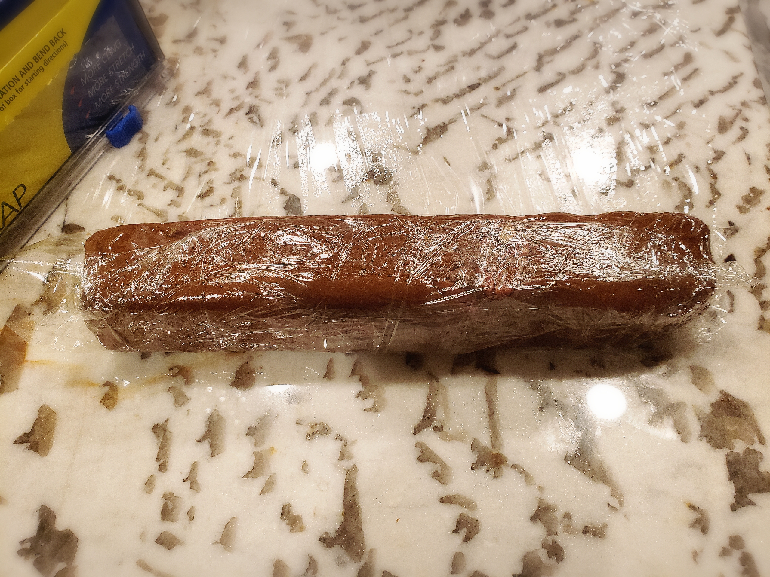 Put a huge layer of plastic wrap on the counter, then take 1/4 part of the dough and put on it. Make a rectangular stick with about 1.5 inch on two shorter sides.