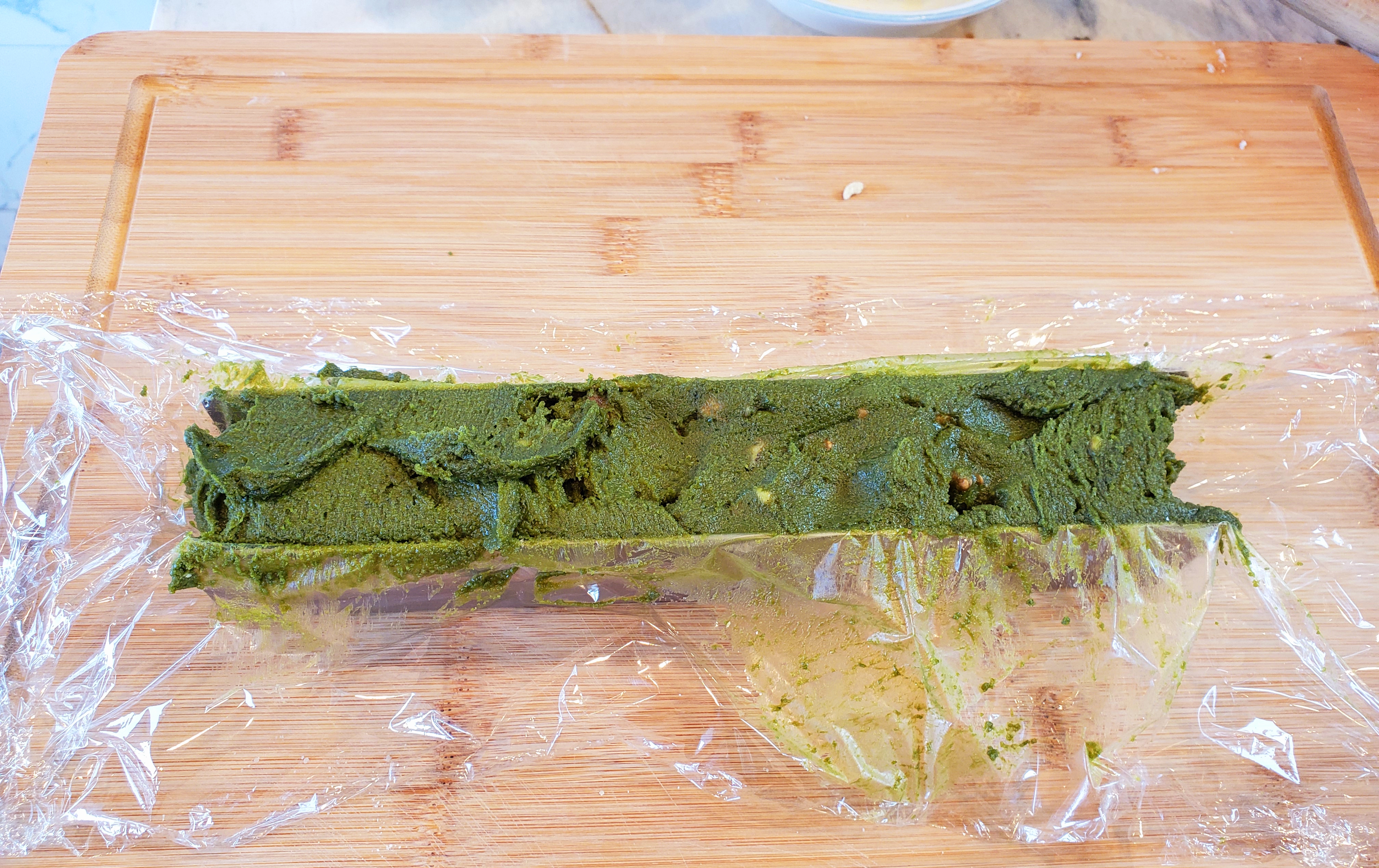 Wrap the batter up with plastic wrap, then put into the freezer for at least 4 hours. We want it frozen a little bit so we can easily cut it..