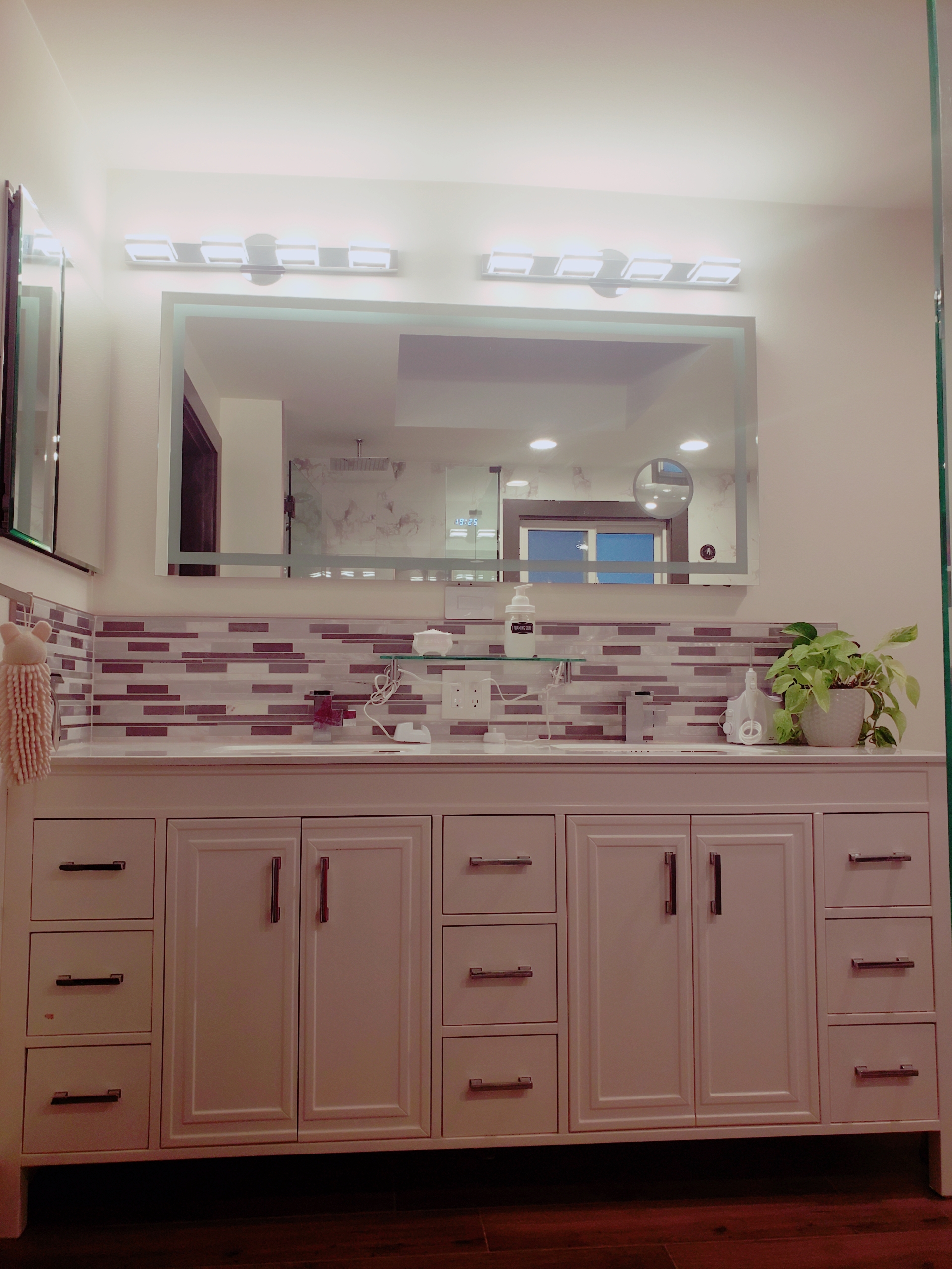 My original design is to have two mirrors in the master bathroom. I planned a lot of electronic outlets in between mirrors and on the two sides of the master vanity. The electrician did not follow my plan. What is worse, he randomly opens up light base on the top of the wall, and installed lights anyway.