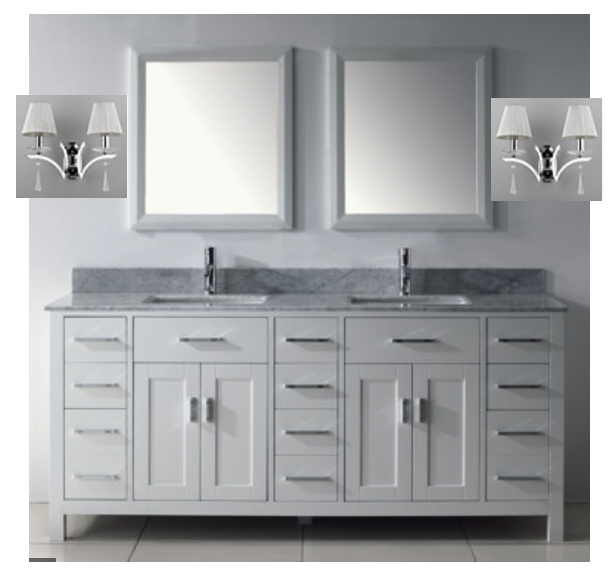 Since we don’t want to re-open the dry wall to reroute the wire, I had to come up with a way to mask it up. In order to mask these wiring mistake, I researched hundreds of bathroom lights, mirrors, and vanities both on line and in stores to understand how I can mask this mistake up without sacrificing my original design style.